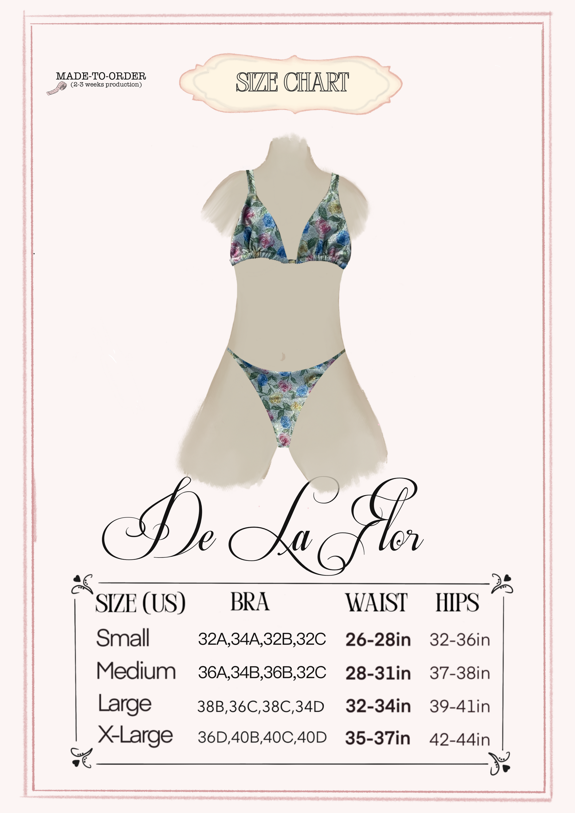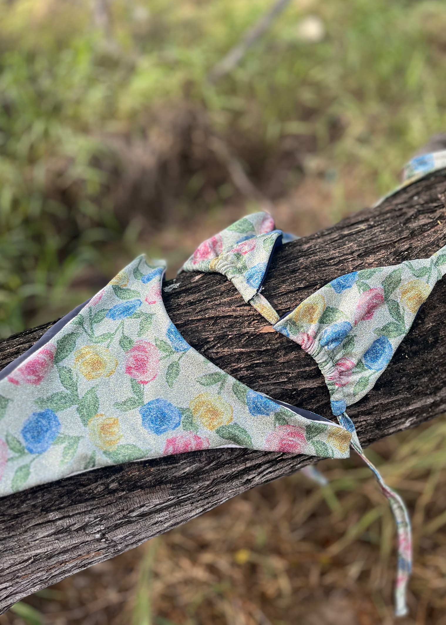 Made with glittery floral fabric and cheeky on the back.